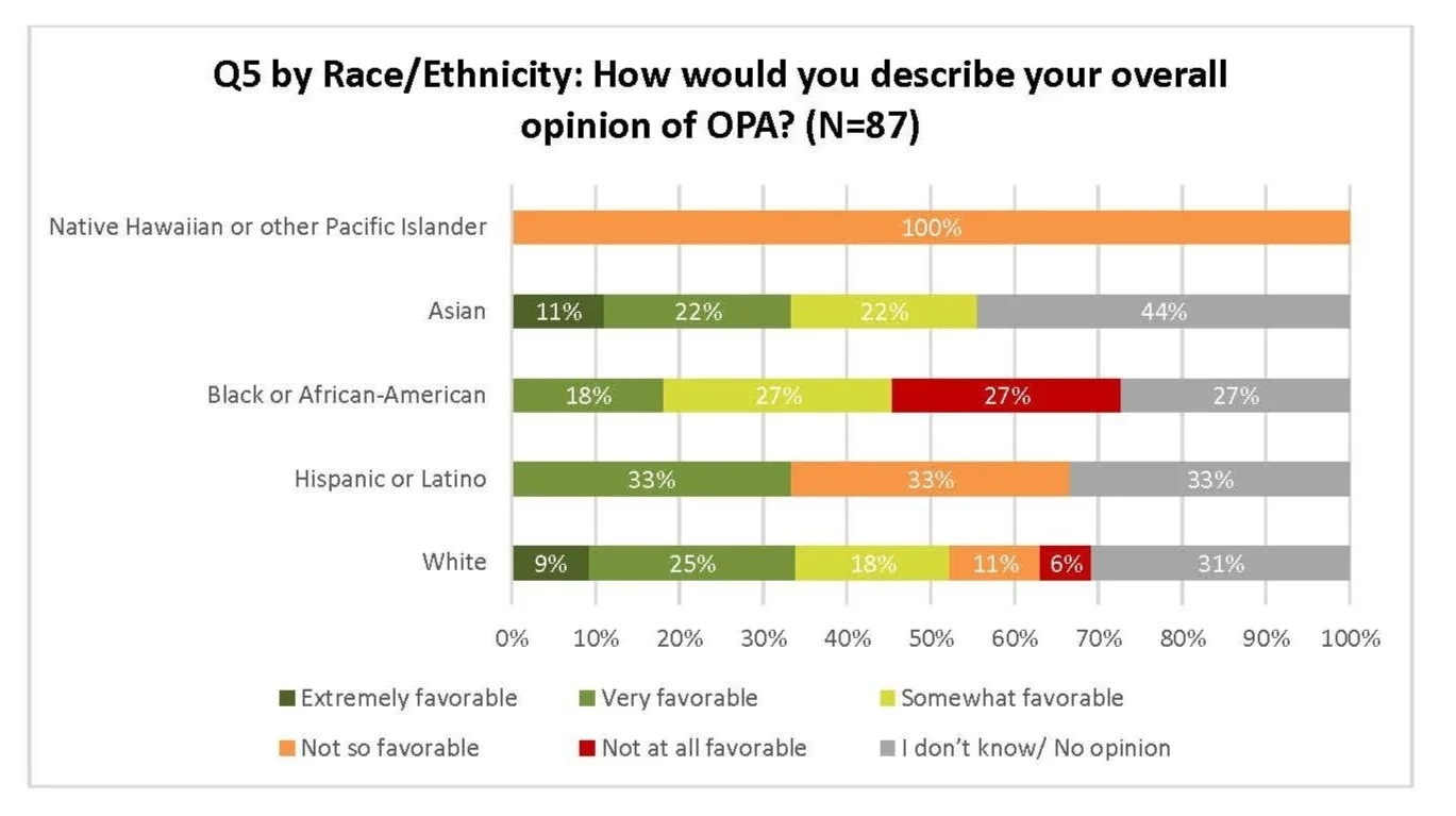 Opinions of OPA differed by race/ethnicity. Respondents who identified as Black or Hispanic were more likely to have an unfavorable view of OPA compared to respondents who identified as White or Asian.