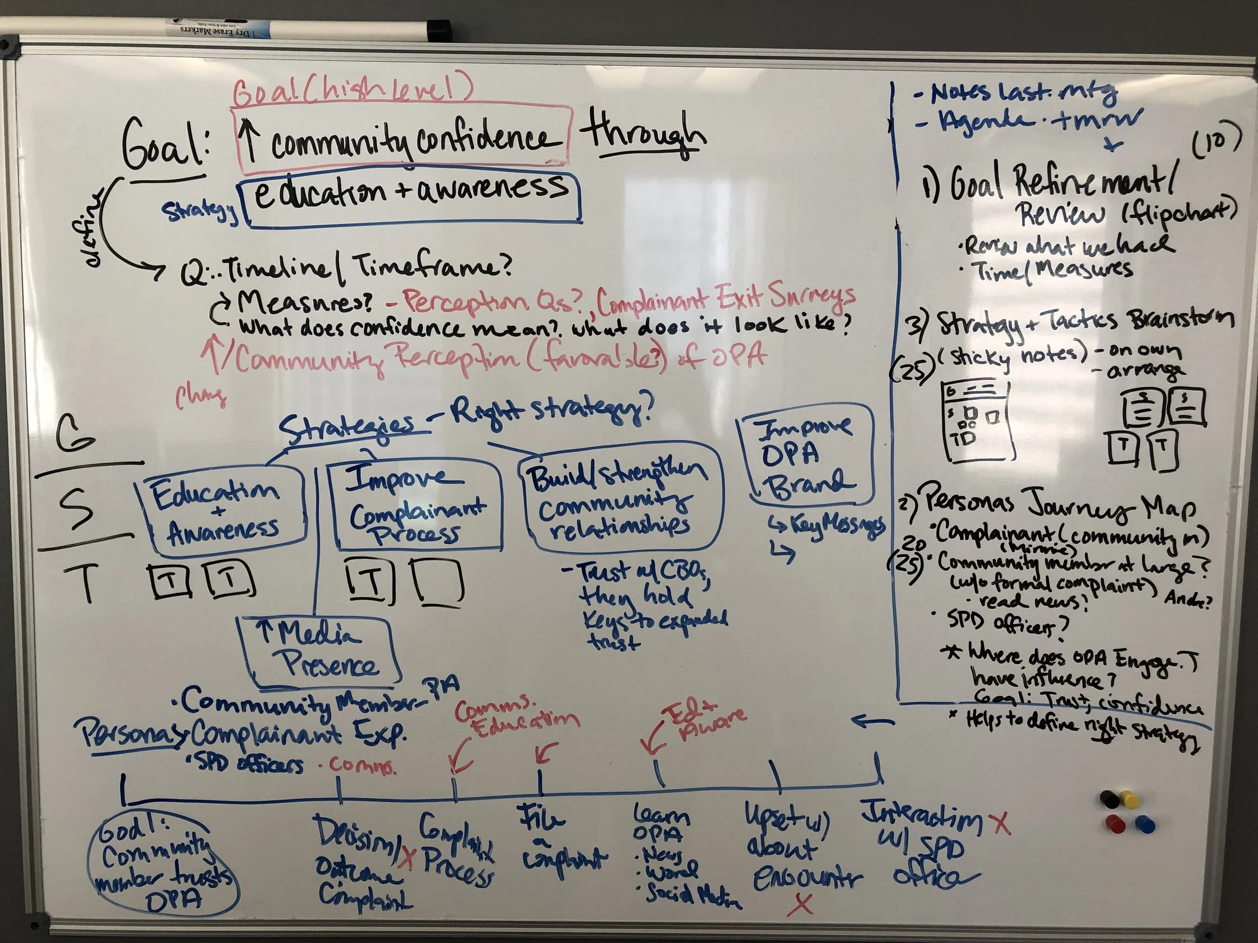 With a baseline established, we then could use the research findings from the public awareness assessment to help us think about goals for outreach. I led a visioning/brainstorm meeting to kick off the plan development phase, making sure everyone was on the same page and getting team buy-in. I also used it as a an opportunity to teach team members about the the strategic planning process and components of a strategic plan.