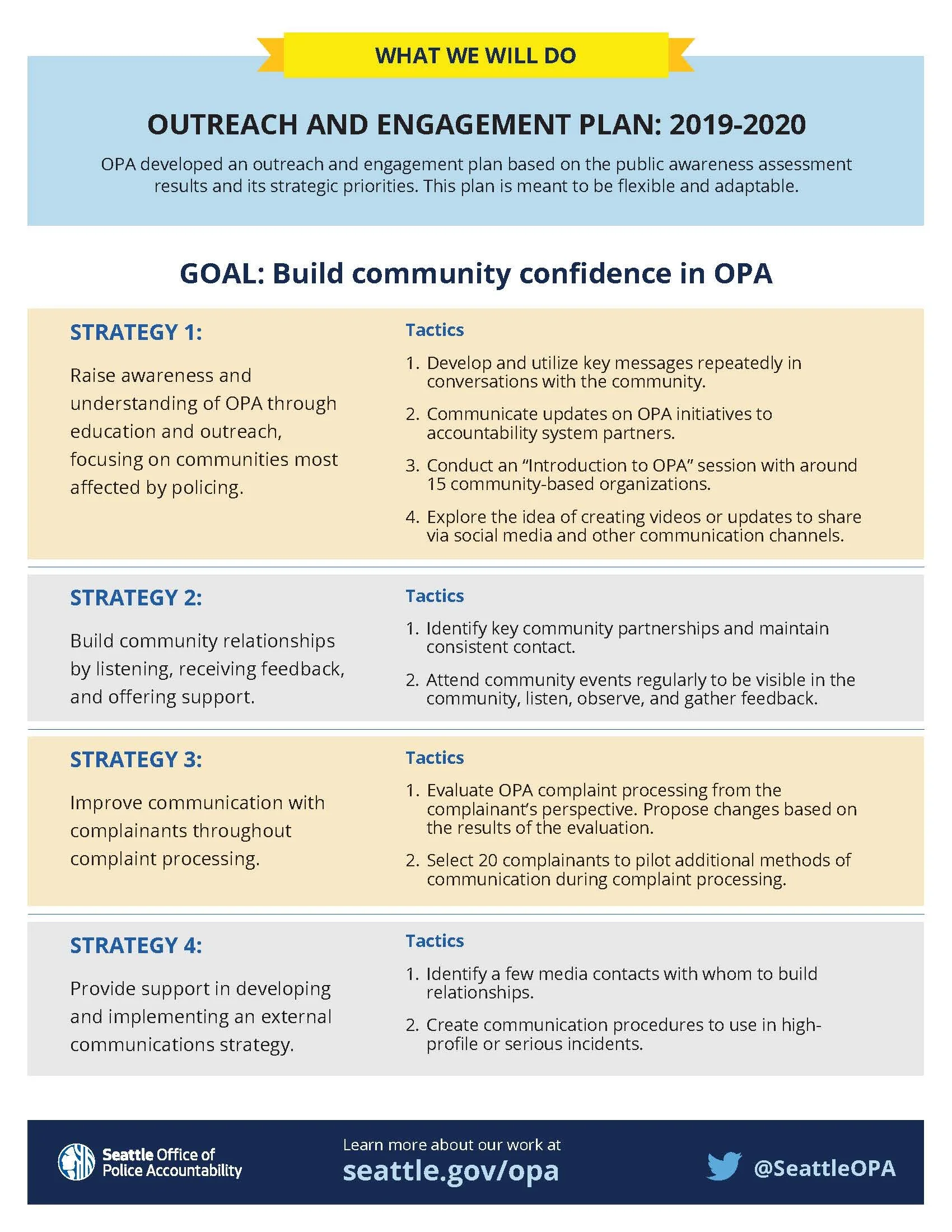 OPA created and hired an outreach and engagement team of three in late 2018 to support OPA’s community engagement efforts. Before this time, OPA did not have a dedicated outreach team or an engagement strategy. Tasked with the goal to broadly “engage with community,” the community engagement team needed a strategic plan to be most impactful.