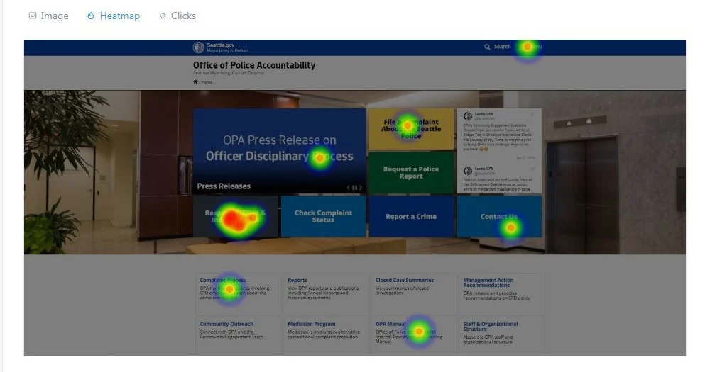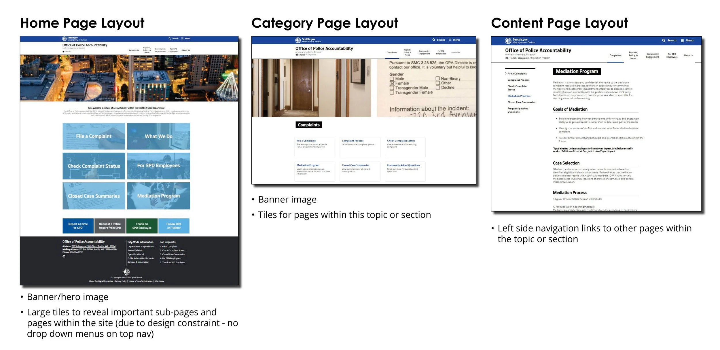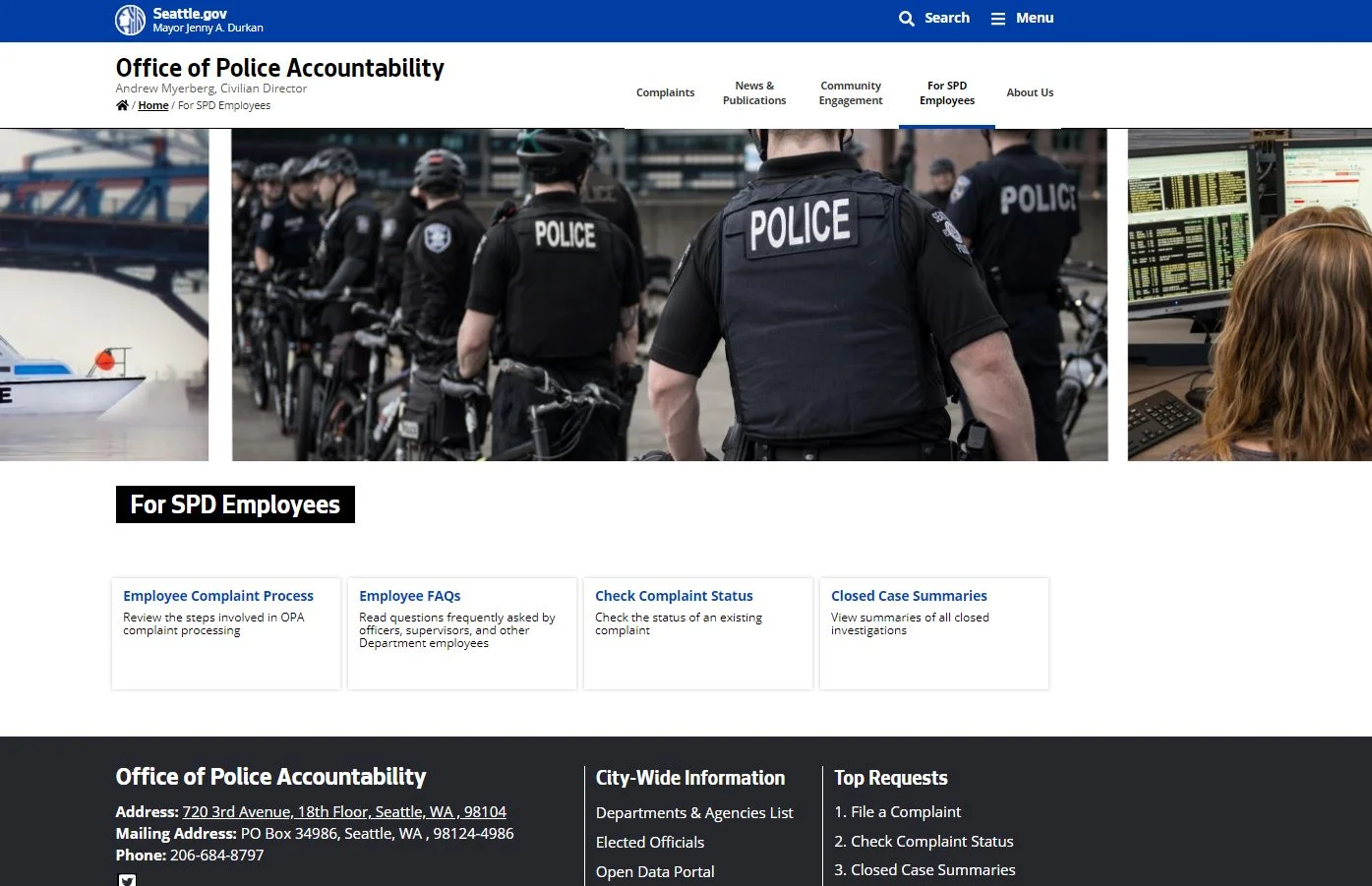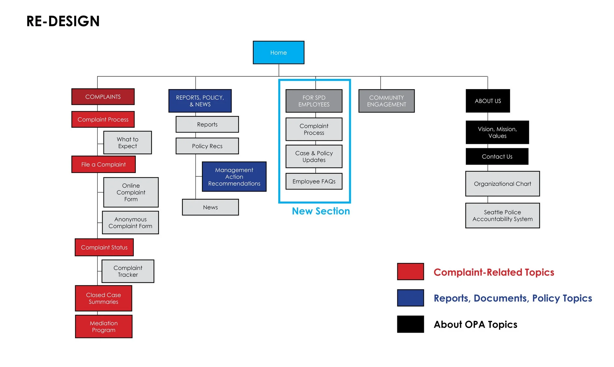 OPA has changed a lot in the past couple years, and the web content was outdated. OPA serves two unique audiences- the general public, who can file a complaint of misconduct about a Seattle Police Department (SPD) employee, and SPD employees named in a complaint. The current website is text-heavy with terms and concepts not widely accessible or understandable by public.